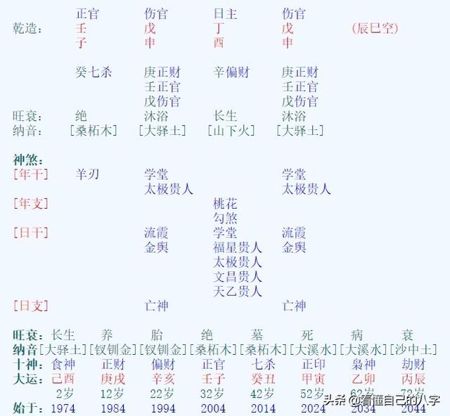 很多人看这个八字都觉得应该是从官格,如果没有丁壬,妥妥从官格没错了,很少有人真正连藏干里都完全没有帮扶的。但是有了丁壬合,到底还是不是从官格,这个有分歧。