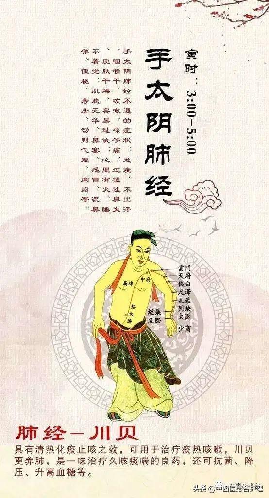 中医称肺脏为“相傅之官”,有宰相之能。经脉气血是按“肺大胃脾心小膀,肾包焦胆肝还肺”的顺序不断运行的,它们分别与寅卯辰巳午未申酉戌亥子丑的时辰相对应,到哪个时辰就哪条经脉做主人。手太阴肺经的流注时间为清晨3:00-5:00,可谓是寅时值班的宰相。
