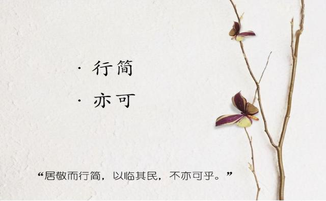 冉雍针对“简”提出了自己的看法:“居敬而行简,以临其民,不亦可乎?居简而行简,无乃大简乎?”意思是态度严肃认真,办事简约,这样来治理百姓,不也可以吗?如果态度简单马虎,办事又太简约,那不是太简单了吗?