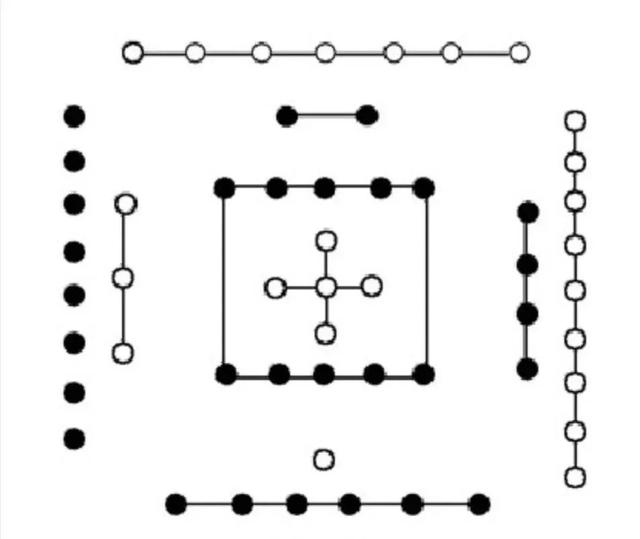 河图之形状为10个数字排列成的四方形,1白点和6黑点位北方代表玄武,属水。2黑点和7白点位南方代表朱雀,属火。3白点和8黑点位东方代表青龙,属木。4黑点和9白点位西方,代表白虎,属金。5白点和10点位中央代表时空奇点,属土。