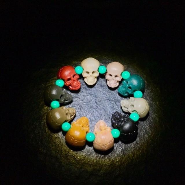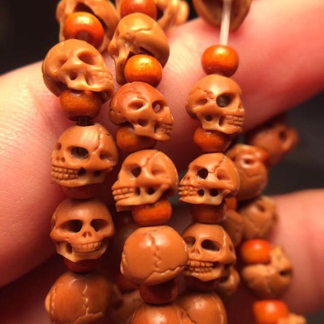 很多人难以接受用人头骨做法器,于是雕刻师脑洞大开——用橄榄核,宝玉石等不同材料制成了骷髅吊坠,骷髅手串,也非常受欢迎。