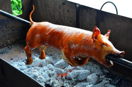 烤乳猪是粤菜系也就是广东菜系,它是粤菜中具有代表性的经典菜式之一。制作烤乳猪要先给猪放血、去毛,将猪清理干净后开始碎骨、腌制的步骤,最后顺着排骨将乳猪叉起来架在炭火上烤即可。烤乳猪的过程中要使用文火,不停将它翻转的同时还要给它刷蜜糖水。