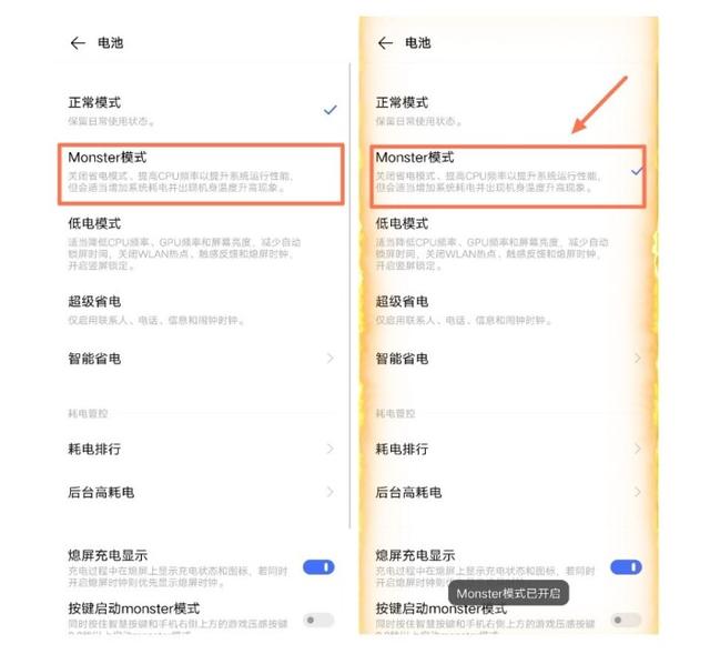 - 在使用Monster模式时,由于性能增加可能会导致电池消耗更快,建议在高性能需求的场景下使用,而在普通使用时可以切换回普通模式以节省电池。