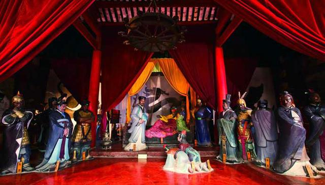这座巍峨的殿堂建于明嘉靖11年(公元1532年)。殿内供奉有刘备、关羽、张飞的彩色塑像。明良殿内最初是公孙述的塑像,是当时的老百姓为了纪念公孙述而建。至明朝,公孙述的塑像被搬开,被刘备等蜀汉君臣所代替。