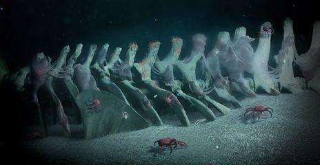 即便被敲骨吸髓之后,鲸落还在继续,巨鲸的矿物遗骸还会作为礁岩成为海底生物的栖息地,这就是鲸落的最后阶段——礁岩阶段。