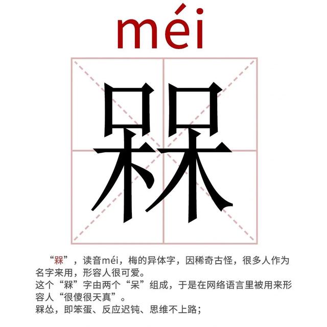 这个“槑”字由两个“呆”组成,于是在网络语言里被用来形容人“很傻很天真”。