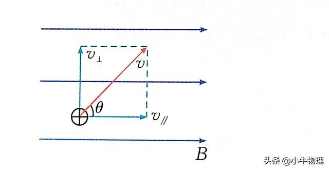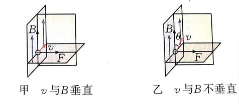 当v与B成θ角时,可以把速度v分解为与B平行的分速度v//和与B垂直的分速度v⊥,与B平行的分速度不产生洛伦兹力,这时F洛=q·v⊥B=q·Bvsinθ(如图所示).