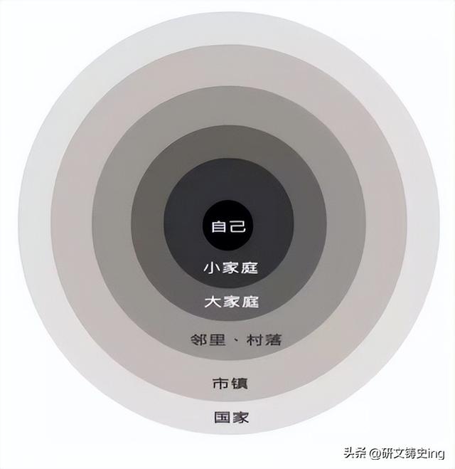 第一,同心圆水波纹。以自己为中心像水波纹一样推及开,愈推愈远,愈推愈薄且能放能收,能伸能缩的社会格局,且它随自己所处时空的变化而产生不同的圈子。