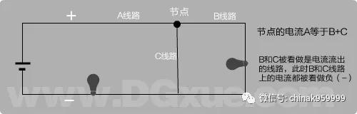 上图中的“节点”的三条线路应用基尔霍夫电流定律来说明,A线路+B线路+C线路的电流恒等于0(永远等于0),图中+到﹣为电流流过的方向,也是电动势(电源)的正负极。