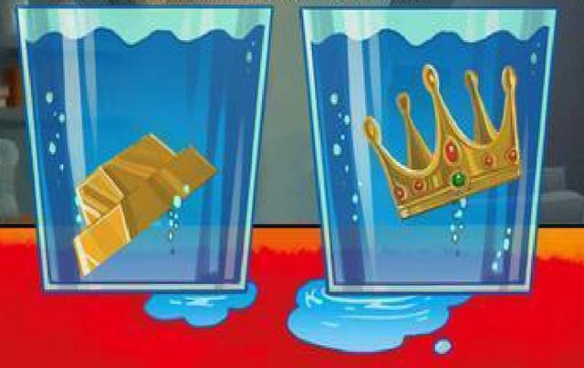 而今天我们来说说经典力学中一个最基本的定律,古老的阿基米德定律。据说,叙拉古国王召见阿基米德,让他鉴定一个黄金王冠是否掺假。阿基米德想了很久也想不出办法。有一次,他在洗澡的时候,突然就想通了,于是光着身子跳出澡盆,大叫“尤里卡”(希腊语,就是“好啊!有办法啦!”)。他想到的办法是什么呢?想到的办法与曹冲称象一样:先将王冠放进装满水的水盆里,看看溢出了多少水,然后再把同样重的纯金放进同样大小且装满水的水盆里,看看溢出了多少水。如果第二次溢出的水稍微少点,就说明纯金的体积比王冠小,那么王冠就被掺假无疑了。