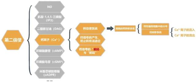 细胞内有五种最重要的第二信使:cAMP、cGMP、1,2-二酰甘油(diacylglycerol,DAG)、1,4,5-三磷酸肌醇(inositol 1,4,5-trisphosphate,IP3)、Ca2+(植物中主要的第二信使)等。