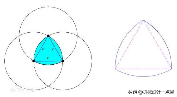 最简单易懂的勒洛多边形,一个定宽曲线。其作法为先画正三角形,然后分别以三个顶点为圆心,边长长为半径画弧所得到的三角形。
