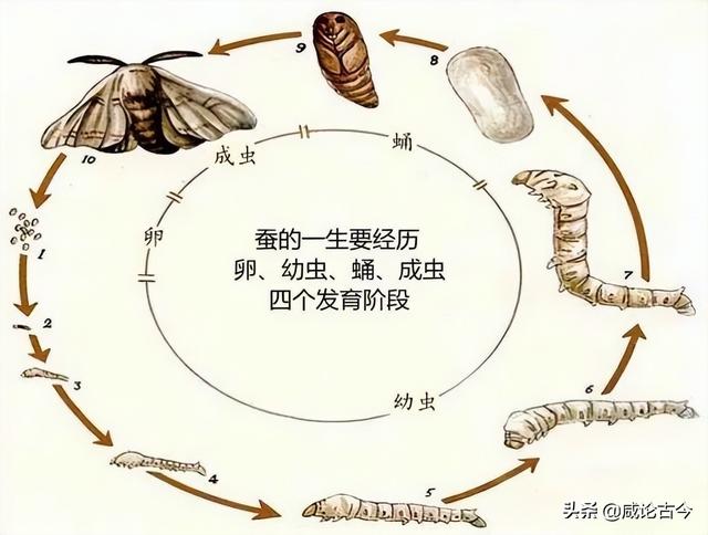 蚕卵--蚁茧--幼蚕--脱皮--吐丝--蚕茧--蚕蛹--蚕蛾