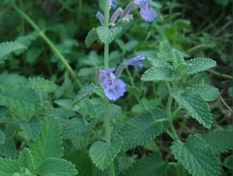 2、猫薄荷(下图):猫薄荷茎直立,叶片卵状至三角状心形,基部叶有柄或近无桶,轮伞花序,小坚果三棱状卵圆形,花期6~8月,果期7~9月。