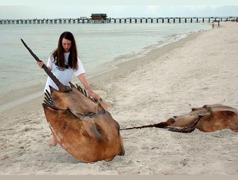 马蹄蟹是用腮呼吸的原始节肢动物,盘状甲壳,针状尾巴,呈青褐色或暗褐色,是四亿五千万年前进化来的、非常古老的生物,是标准的海洋“活化石”。