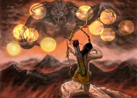 在众多神话中有这么一个传说:上古年间,十日乱世,天地万物在十个太阳的炙烤下逐渐凋零,草木枯萎,人畜无神。人类英雄羿为了拯救天地万物,用神弓射下九个太阳使得苍生免受十日炙烤之苦,但也因此得罪了天帝,因为十日是天帝帝俊与光明女神羲和之子。后世之人感恩羿之功德尊其为“箭神”,这就是“羿射九日”的故事。
