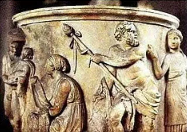 狄奥尼索斯,后来被罗马人称为酒神,手持茴香权杖交织着常春藤叶子并且顶部有一个松果。