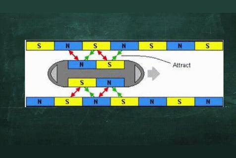 磁悬浮列车没有引擎还能高速运行,也是应用了磁铁吸力和排斥力来推动列车前行,通电后,它们就会变成一节节带有N极和S极的电磁铁,轨道磁铁N极与列车上磁铁N极相斥会将列车往前推,下一节轨道磁铁N机与列车磁铁S相吸会将列车往前拉,轨道上的电磁铁会根据列车前进而不断变化磁极,保证磁悬浮列车不断向前推进,磁力既可以让列车悬浮又可以推动列车前进。