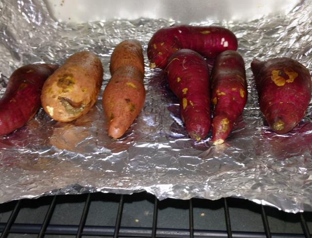 第四步,然后直接放入在烤箱中,调至温度200度,35分钟的时间,可以看到稍微小一点的红薯已经微微有些冒油了,说明烤熟了,先将小一点的取出来;