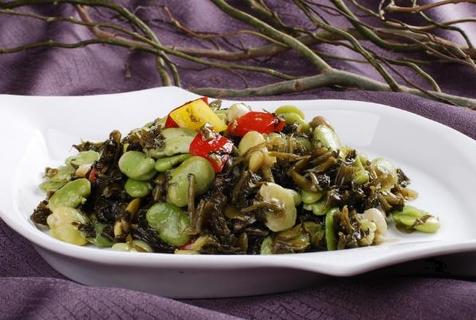 食材:蚕豆500克、雪菜1袋、新鲜的小红辣椒4根、干红辣椒5根、盐1/2茶匙。