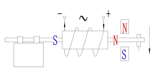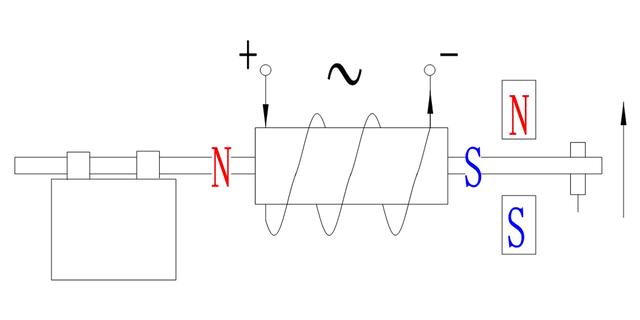 当螺线管通电,电流方向如上图。根据右手螺旋定则,此时螺线管左端为N极,右端为S极,穿过螺线管的振动片被磁化右端为S极,与磁极片(永久磁铁)由于同性相斥,异性相吸的原理,振针向上运动,远离复写纸。